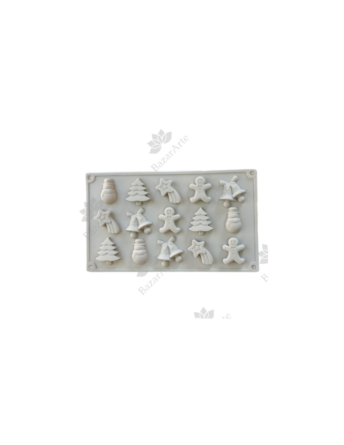 Molde de silicona con 15 figuras: pino navideño, mono de nieve, juego de campanitas, galleta de jengibre, estrella.